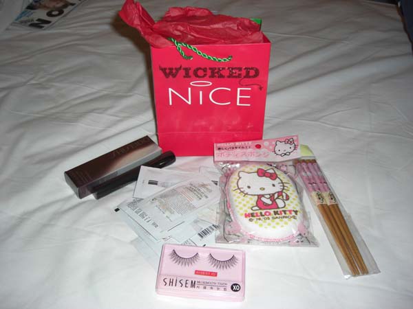 Sweet Shisem lashes, cute cute Hello Kitty sponge and chopsticks, packets of samples, and Shiseido Mascara Base. I LOOOOVE the mascara base, it looks like I am wearing falsies when I use it, so thank you thank you thank you, I LOVE IT!